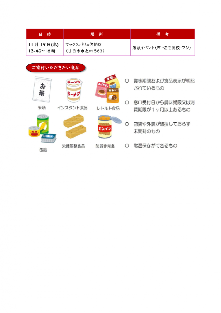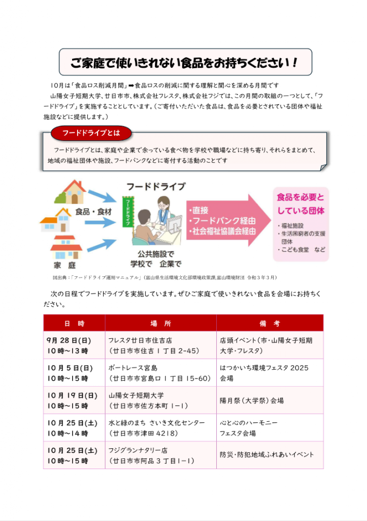 2025.10.0110月19日(日)大学祭でフードドライブを実施します お知らせ 企業の方 卒業生の方 受験生の方 在学生の方 地域の方 廿日市市が展開している食品ロスなど3つの「食」をテーマにした「はつかいちmottainai大作戦」特設サイトでも紹介されています。 https://hatsumeshi.com/202410_fooddrive-2 前の記事へ 記事一覧へ 次の記事へ