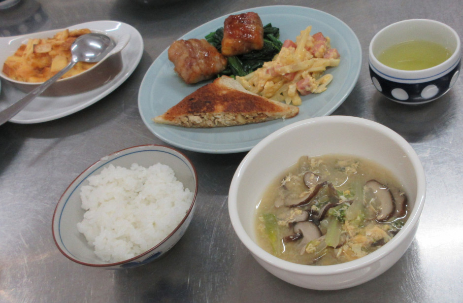 食生活改善推進員を中心として近隣にお住いの15名の参加者の方々とともに、家庭で余りがちな食材を使った「食べきりレシピ」のうち4品を調理し、みんなで試食しました。