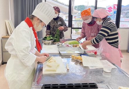 12月19日(金)、家庭からの食品ロス(まだ食べられるのに捨てられてしまう食品)削減実践のため、食物栄養学科栄養調理コースの2年生が、廿日市市友和市民センターで、「家庭で余りがちな食材食べきり教室」を行いました。