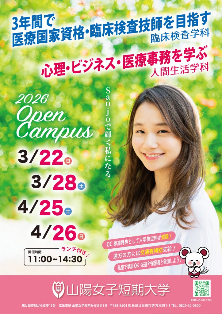 2026.03.233月28日(土)オープンキャンパス申込み受付中! お知らせ 企業の方 卒業生の方 受験生の方 在学生の方 地域の方 お申込みはこちらから ※気象状況等の影響により内容の変更や、やむを得ず中止させていただく場合があります。 変更が生じた場合は、本学HPにて随時おしらせいたします。 前の記事へ 記事一覧へ